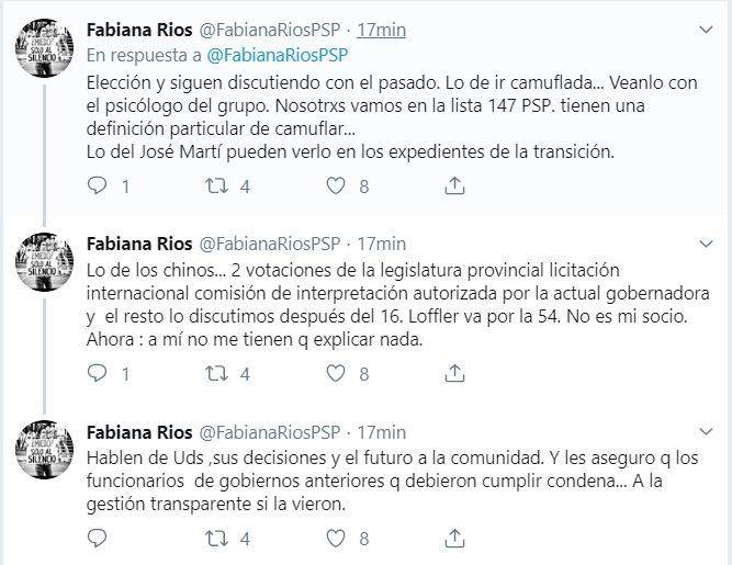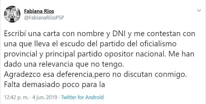 La historia no termina con esto, la ex mandataria volvió a responder el comunicado a través de su cuenta de Twitter: «Escribí una carta con nombre y DNI y me contestan con una que lleva el escudo del partido del oficialismo provincial y principal partido opositor nacional. Me han dado una relevancia que no tengo.» A lo que agregó «Agradezco esa deferencia pero no discutan conmigo, falta demasiado poco para la elección y siguen discutiendo con el pasado.»