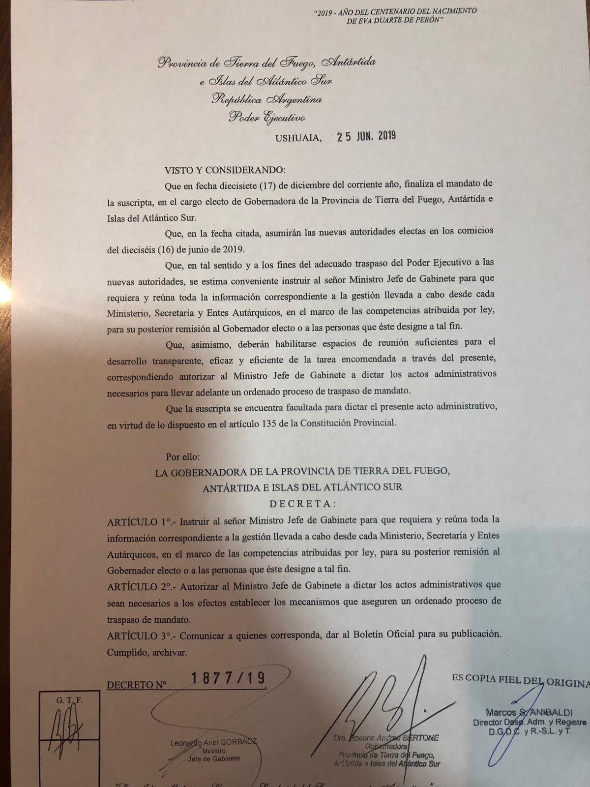 A través del decreto 1877/19, la gobernadora Rosana Bertone estableció los pasos administrativos con el objetivo de llevar adelante una transición ordenada del Poder Ejecutivo a las nuevas autoridades que asumirán el 17 de diciembre.