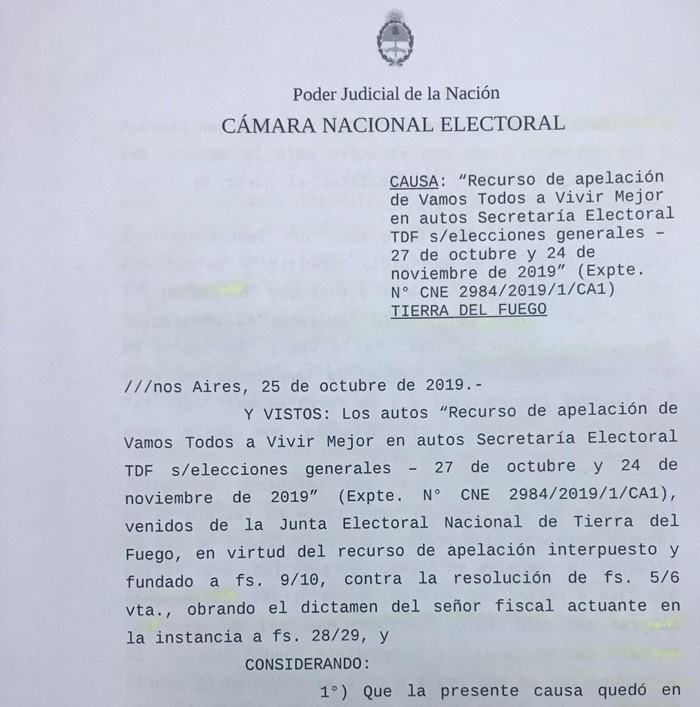 Fue a partir de un fallo emitido en el día de ayer viernes 25 de octubre, donde se analizó la apelación presentada por el Frente Vamos Todos a Vivir Mejor que integra Forja en Tierra del Fuego.