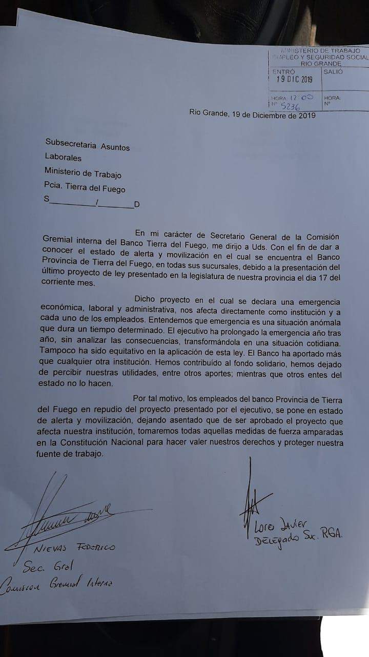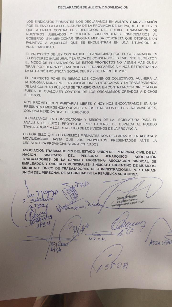 Diferentes gremios firmaron hoy una declaración de alerta y movilización por el paquete de leyes enviado por el Ejecutivo Provincial a la Legislatura que según las organizaciones atentaría contra sus derechos y que, además, otorgaría superpoderes al gobierno que según su postura no serían necesarios.