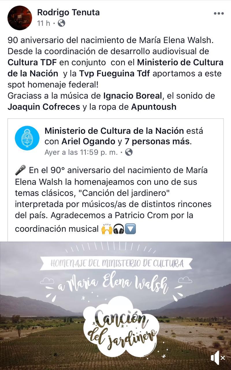 Por otro lado, desde la Coordinación de Desarrollo Audiovisual de Cultura TDF en conjunto con el Ministerio de Cultura de la Nación y la Tvp Fueguina TDF aportaron en la elaboración del spot en homenaje a María Elena Walsh.