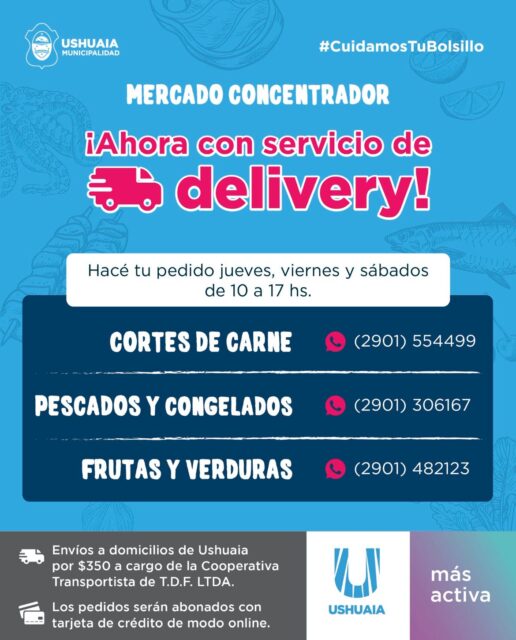 También, el funcionario resaltó el servicio de delivery que continúa vigente, con envíos a domicilio a cargo de la Cooperativa Transportista de Tierra del Fuego por 350 pesos. Los pedidos podrán hacerse para cortes de carnes al (02901) 554499; para pescados (02901) 306167 y para frutas y verduras (02901) 482123. En todos los casos, los pedidos serán abonados con tarjeta de crédito de modo on line.