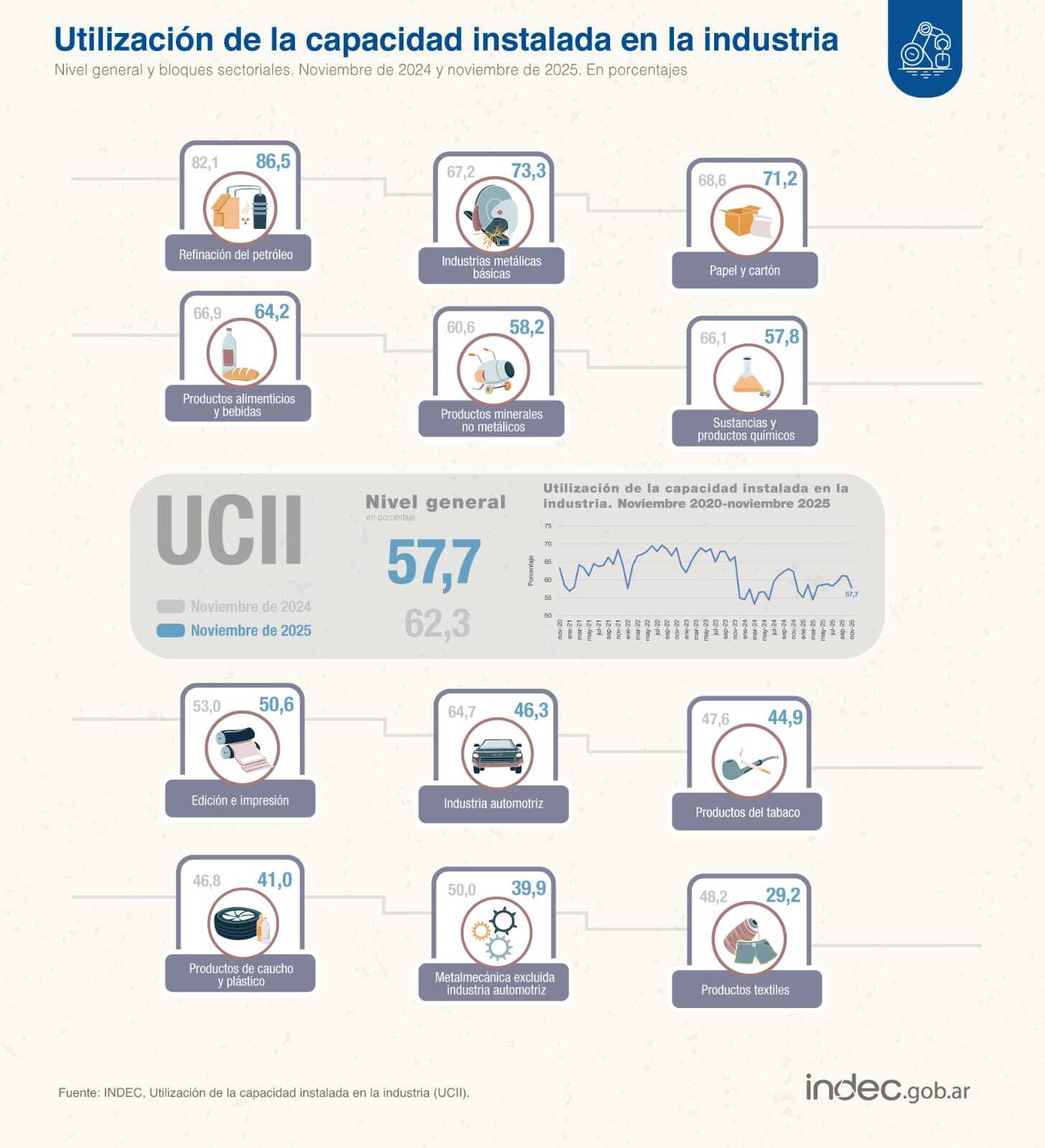 La utilización de la capacidad instalada en la industria se ubicó en 57,7% en noviembre de 2025, lo que representó una caída de 4,6 puntos porcentuales frente al mismo mes del año anterior, cuando había alcanzado el 62,3%. El dato reflejó un retroceso respecto de los niveles observados en septiembre y octubre, cuando el indicador había superado el 61%.