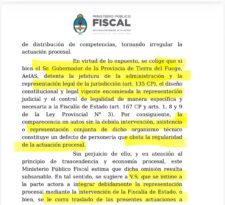 Estas observaciones fueron luego recogidas por el Juzgado Federal de Ushuaia, que resolvió correr traslado a la Fiscalía de Estado antes de avanzar en el expediente.